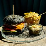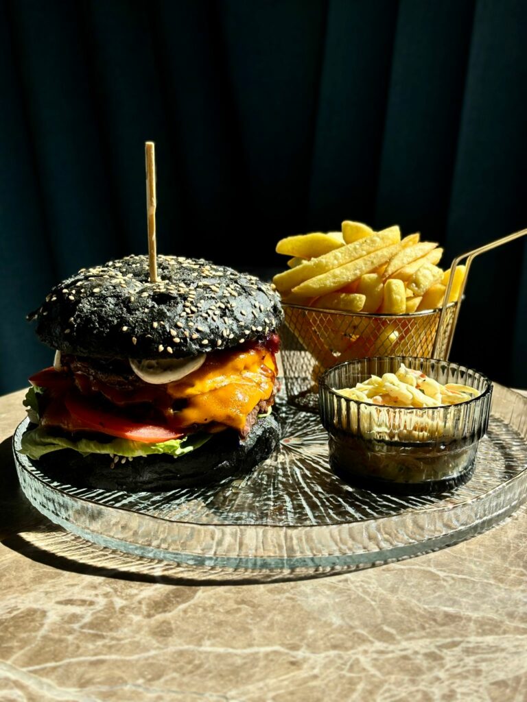 potrójna wołowina smash Black Angus, ser mimolette, pomidor, słata rzymska, chutney z czerwonej cebuli, sos truflowy, czarna brioche