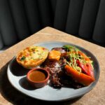 polędwica wołowa, dziki brokuł, puree truflowe, sos estragonowy