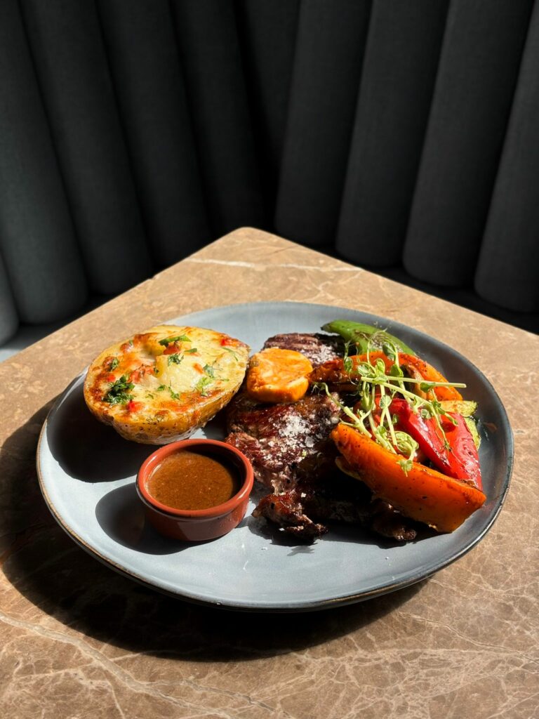 grillowane warzywa, ziemniak zapieczony z serem Gruyere, sos z zielonego pieprzu